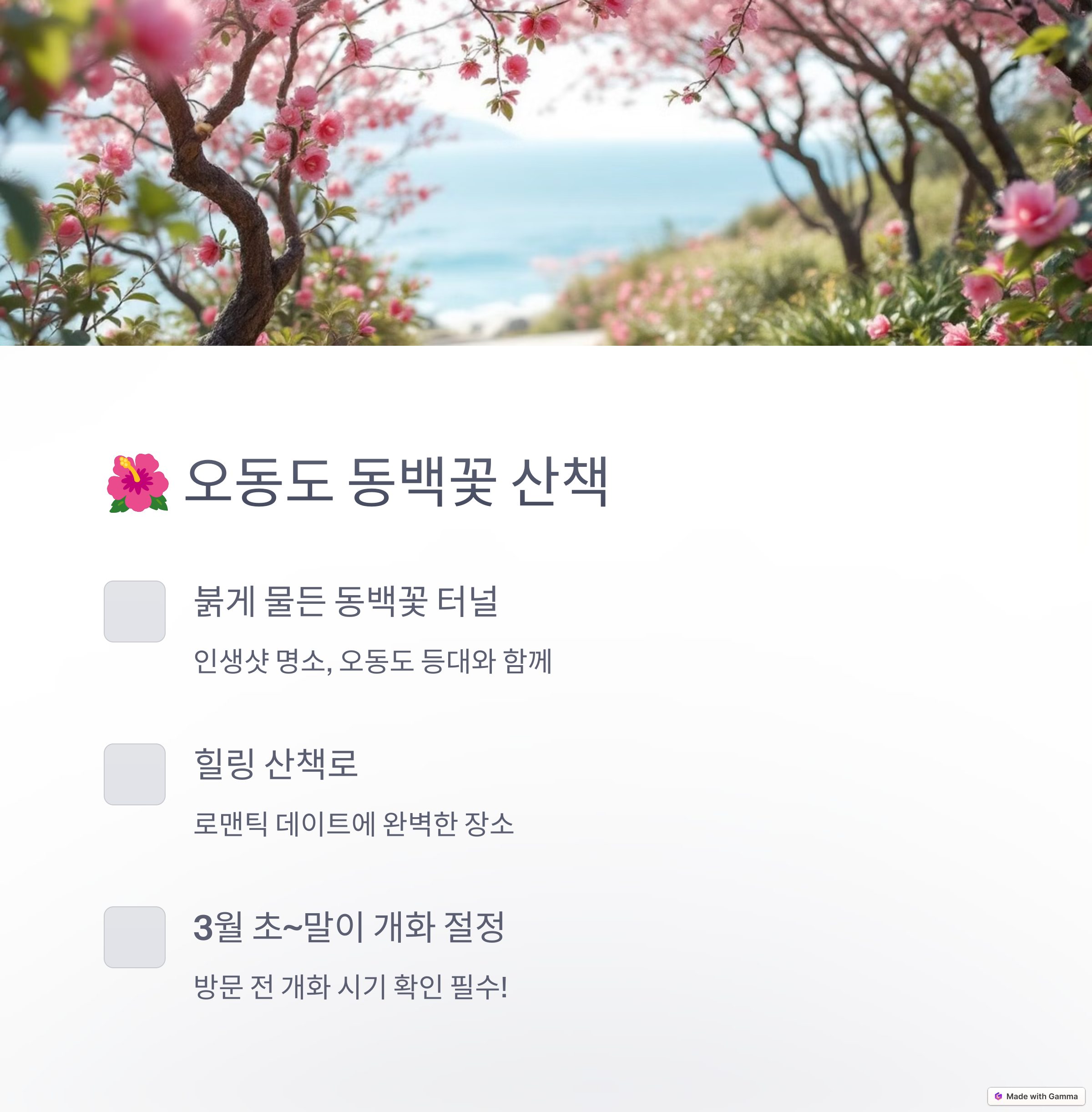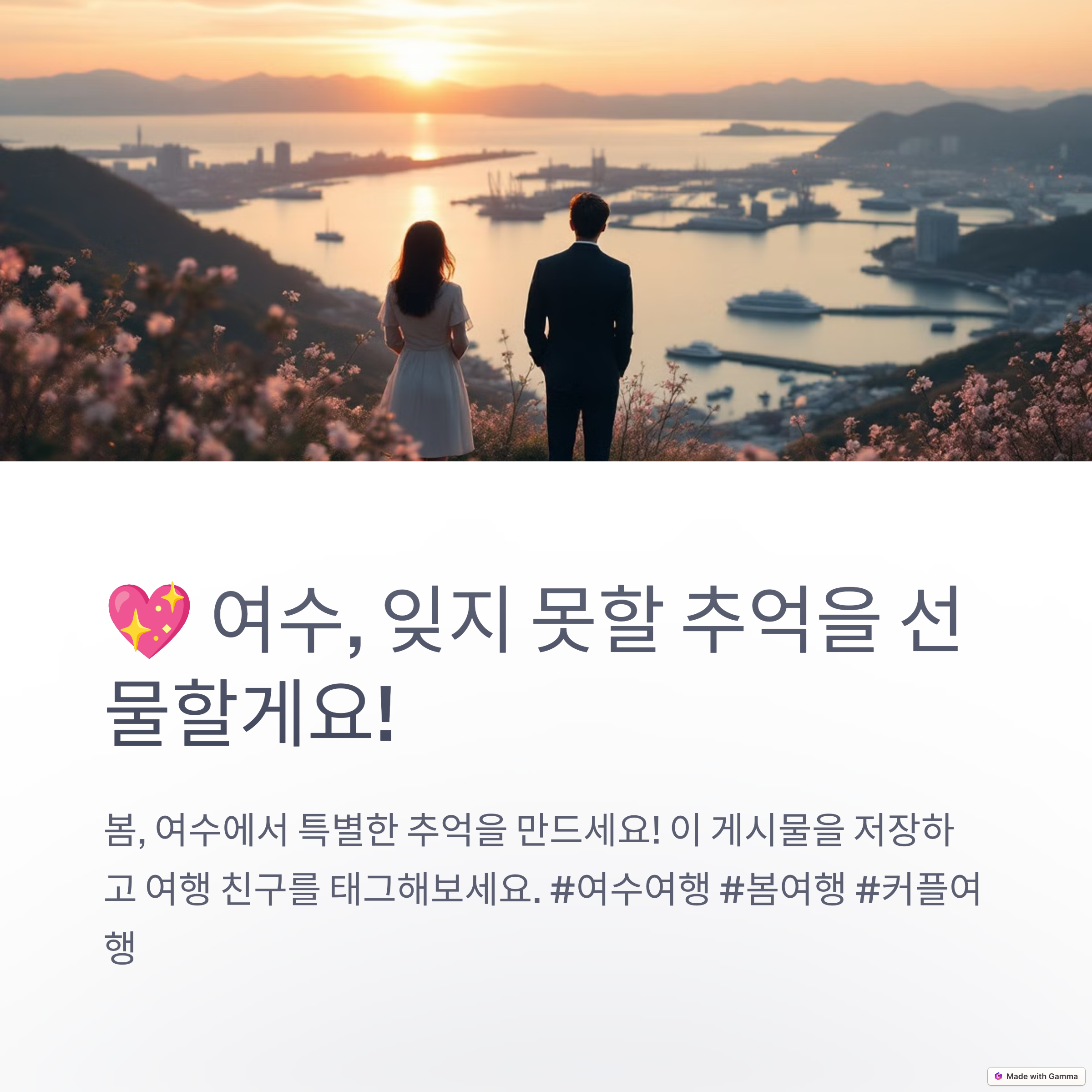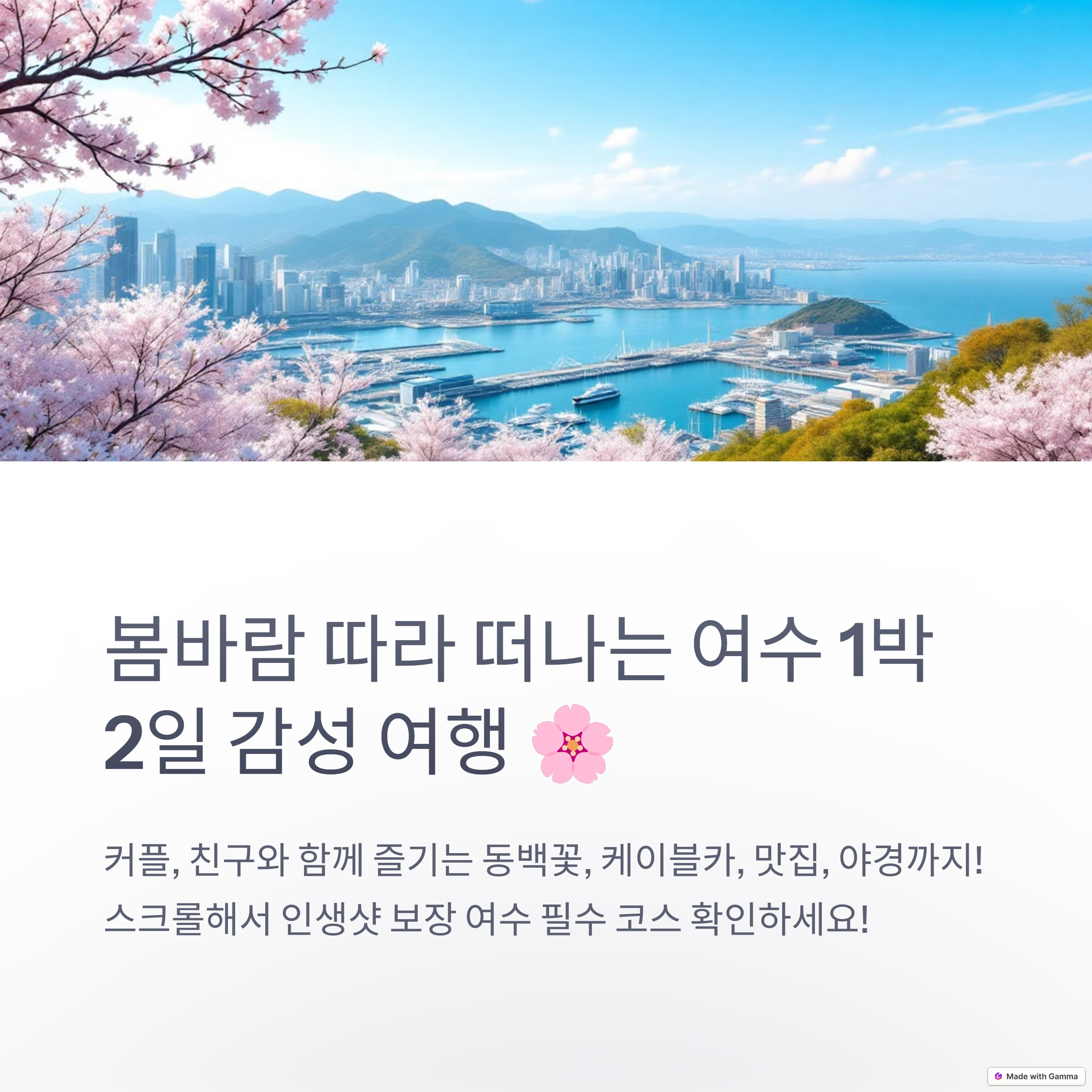 여수는 계절을 막론하고 매력적인 여행지이지만 봄에 찾으면 유독 감성적으로 다가오는 도시입니다. 오동도의 동백꽃, 케이블카에서 바라본 노을, 고소동 골목의 색감, 낭만포차의 풍성한 먹거리까지 어느 하나 빠질 것 없는 여행 코스를 1박 2일이라는 일정 안에 자연스럽게 녹여낼 수 있었습니다. 다양한 연령층이 함께 즐길 수 있는 구성과 SNS 감성까지 충족하는 스팟들이 가득한 여수는 그 자체로 완벽한 여행지였습니다. 봄날의 햇살 아래, 바닷바람과 함께 힐링과 설렘을 동시에 느끼고 싶다면 이번 주말엔 여수로 떠나보시는 건 어떨까요?