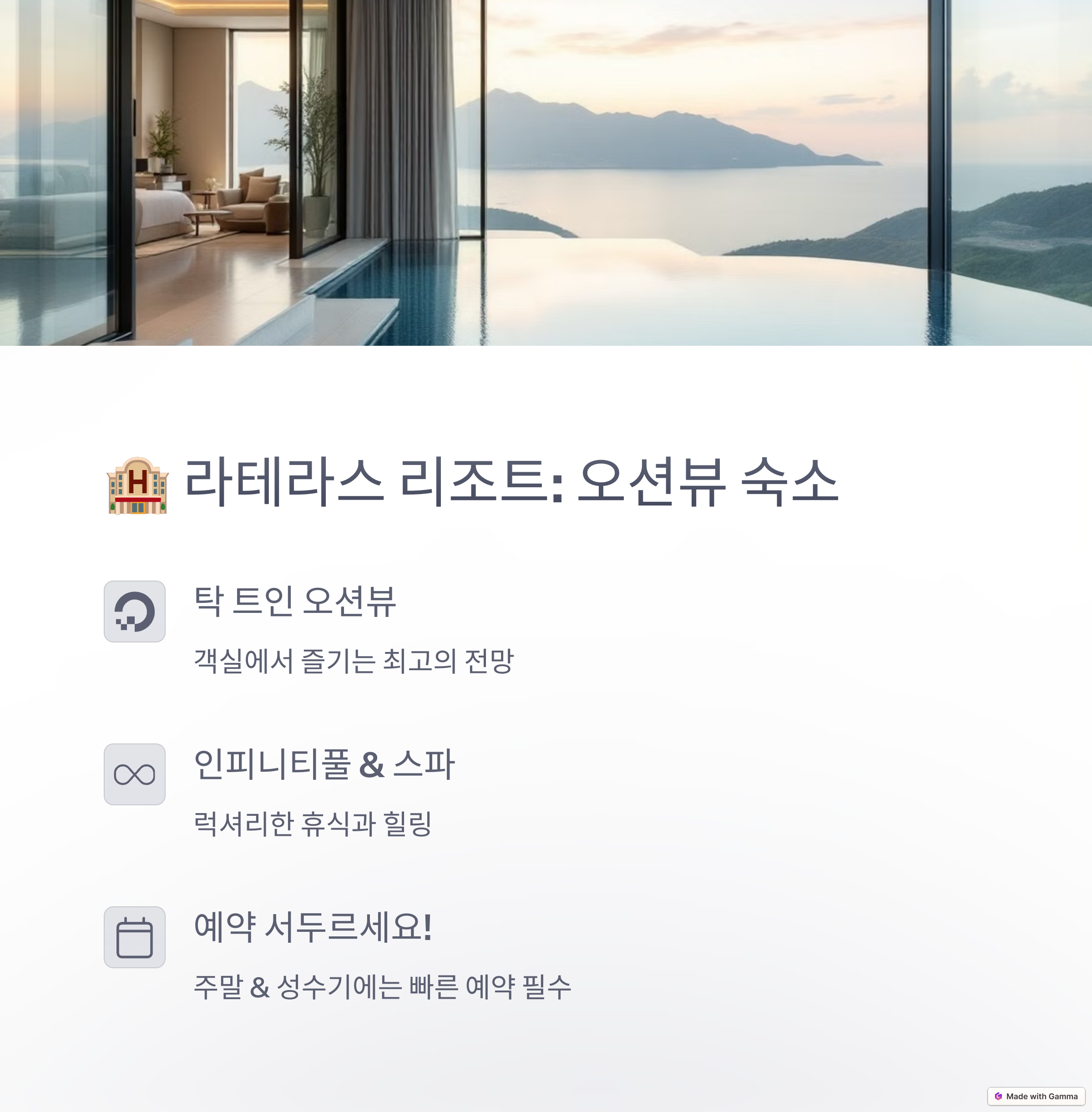 | 밥도둑 메뉴와 든든한 한 끼 제공 | 커플, 친구와 즐기기 좋은 감성 여행 | 조식 제공, 루프탑 수영장 완비 |