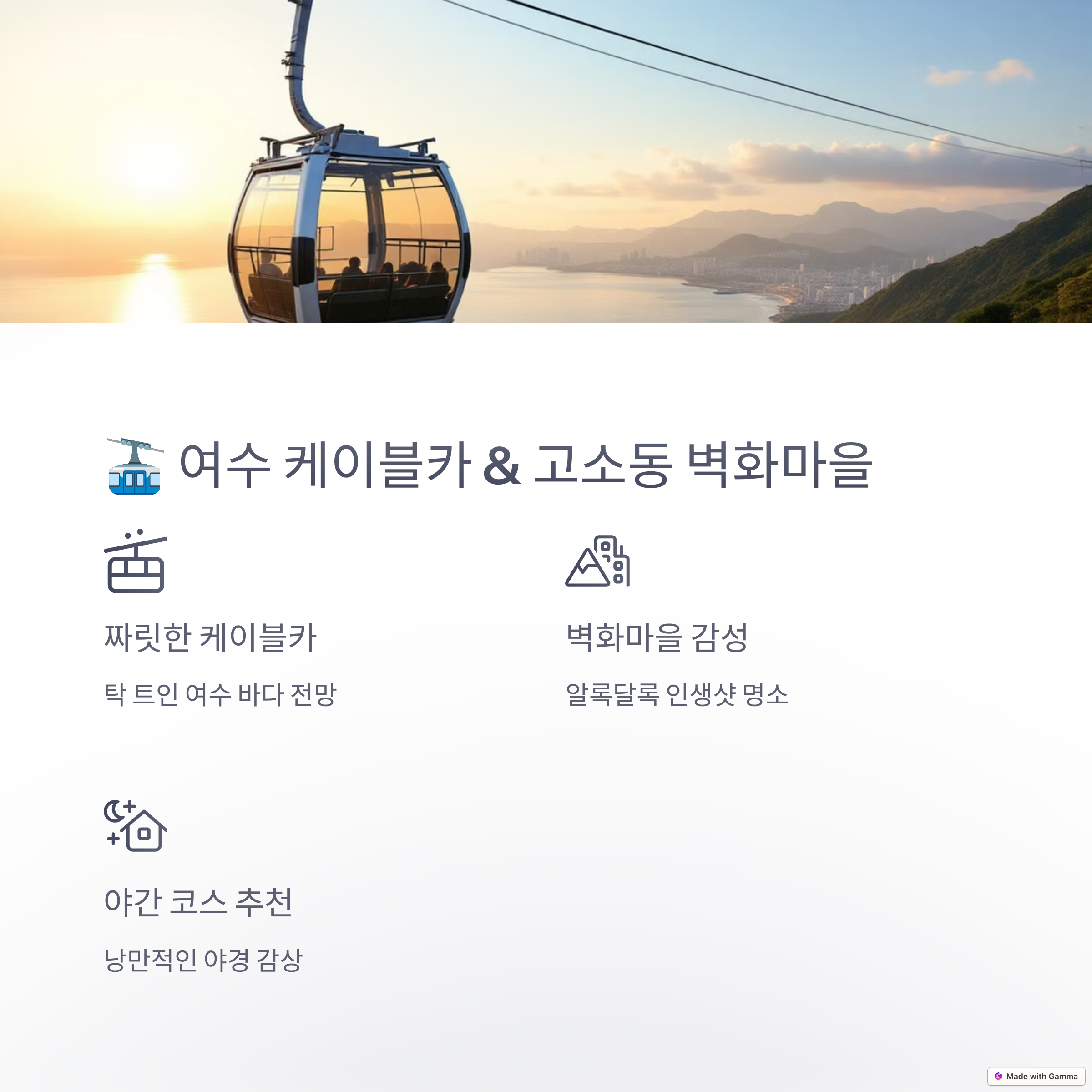 | 여행 팁 | 케이블카는 노을 전 탑승, 고소동은 편한 신발 필수 |