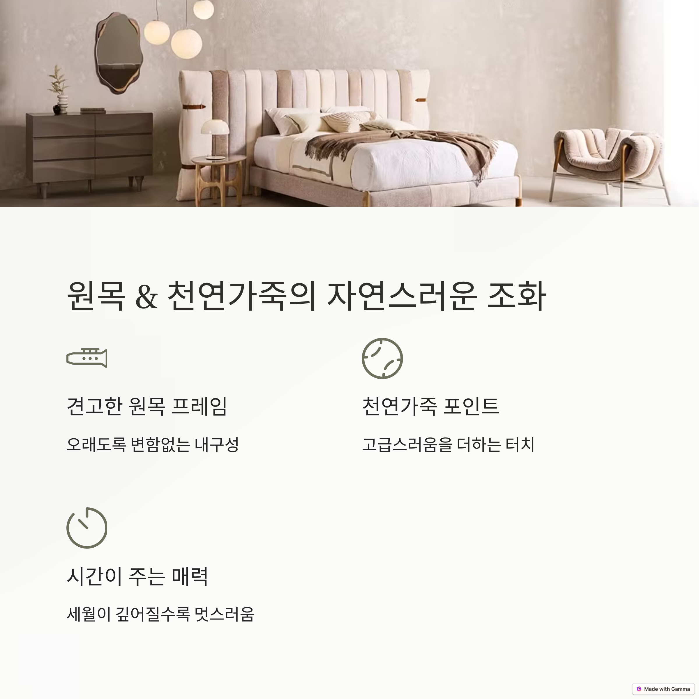 | 하이엔드 가구 | 천연가죽, 고급 패브릭, 원목을 믹스한 프리미엄 라인 |